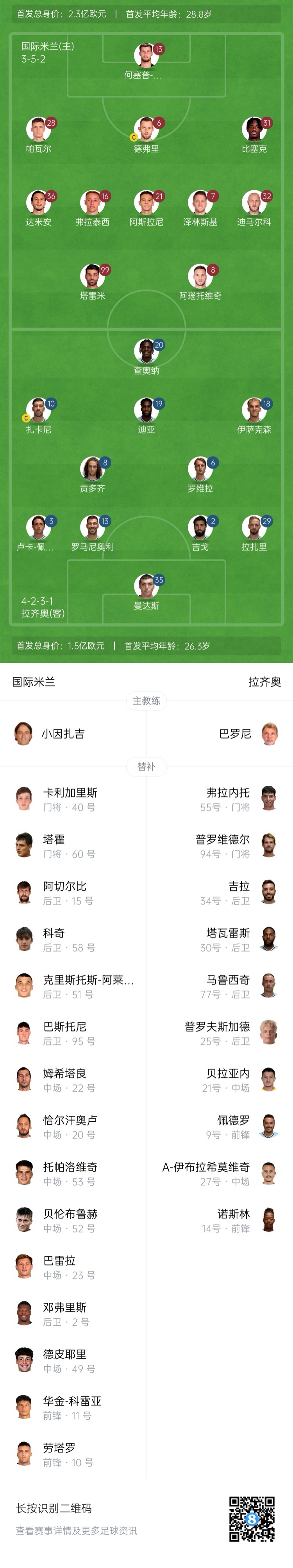 國米替補:40-卡利加里斯、60-塔霍、2-鄧弗里斯、10-勞塔羅、11-華金-科雷亞、15-阿切爾比、95-巴斯托尼、30-奧古斯托、23-巴雷拉、20-恰爾汗奧盧、22-姆希塔良、49-德皮耶里、51-阿萊西奧、52-貝倫布魯赫、53 托帕洛維奇、58 科基