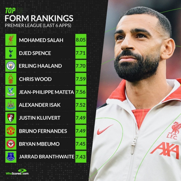 2025-02-26 05:01:05英超近期狀態榜:薩拉赫獨自領跑,斯賓塞、哈蘭德、B費在列