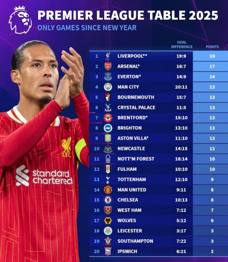 2025-02-26 05:01:202025英超積分榜:利物浦19分、阿森納17分,曼聯(lián)切爾西各8分