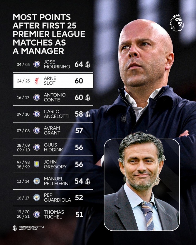2025-02-19 20:24:05執(zhí)教英超前25場積分:穆帥64分最多,斯洛特60分次席&瓜帥52分