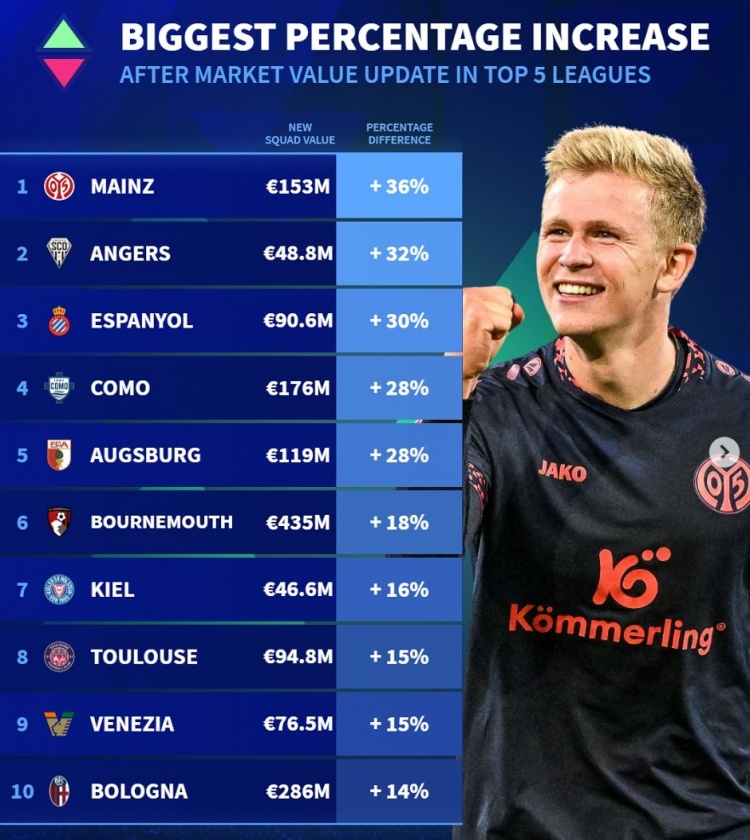 2025-03-28 13:15:40五大聯(lián)賽球隊身價升值比例:美因茨漲36%,博洛尼亞&伯恩茅斯在列