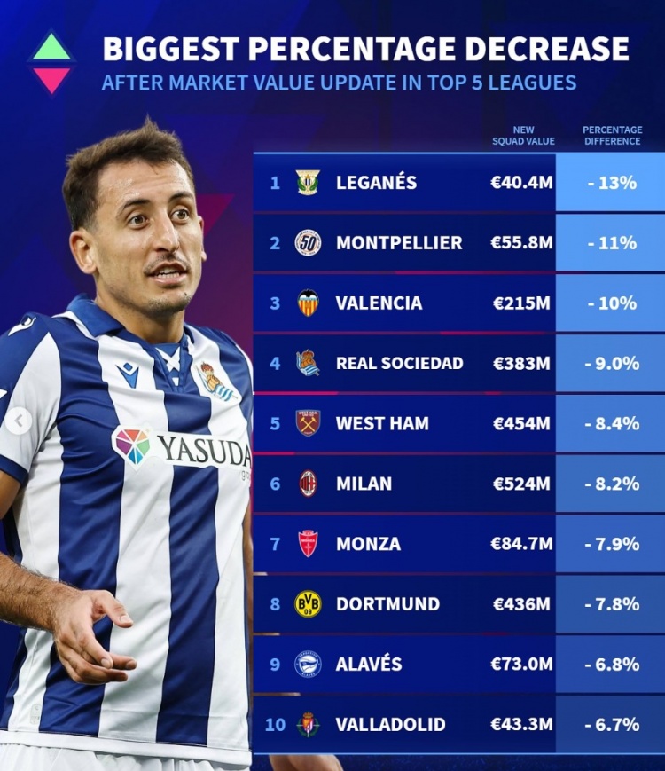 2025-03-28 13:15:45五大聯賽球隊身價貶值比例榜:米蘭多特下降約8%,皇社西漢姆在列