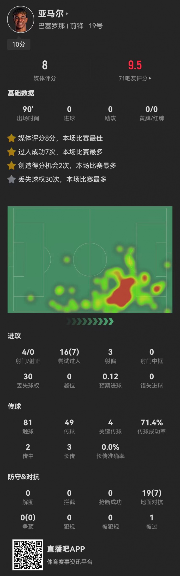 2025-03-28 13:20:40亞馬爾本場4射0正+4關(guān)鍵傳球 7成功過人+2造良機(jī)+30次丟失球權(quán)
