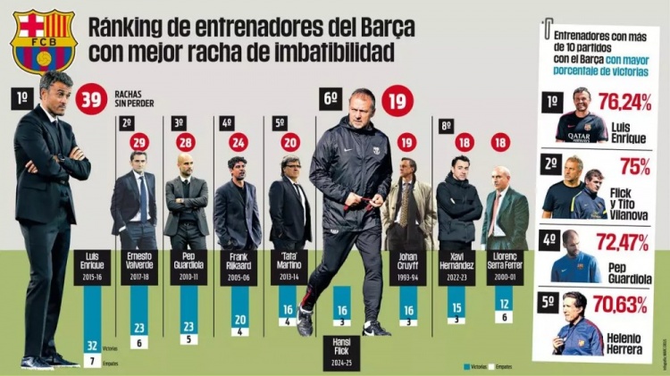 巴薩隊(duì)史主帥連續(xù)不敗場(chǎng)次排行榜: