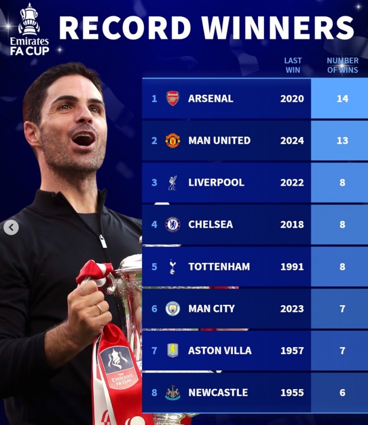 2025-03-30 14:09:45德轉列足總杯歷史奪冠榜:阿森納壓曼聯(lián)居首,曼城&維拉各7冠
