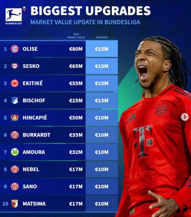 2025-03-30 14:10:58德轉列身價更新后德甲升值榜:奧利塞&塞斯科&埃基蒂克漲1500萬歐