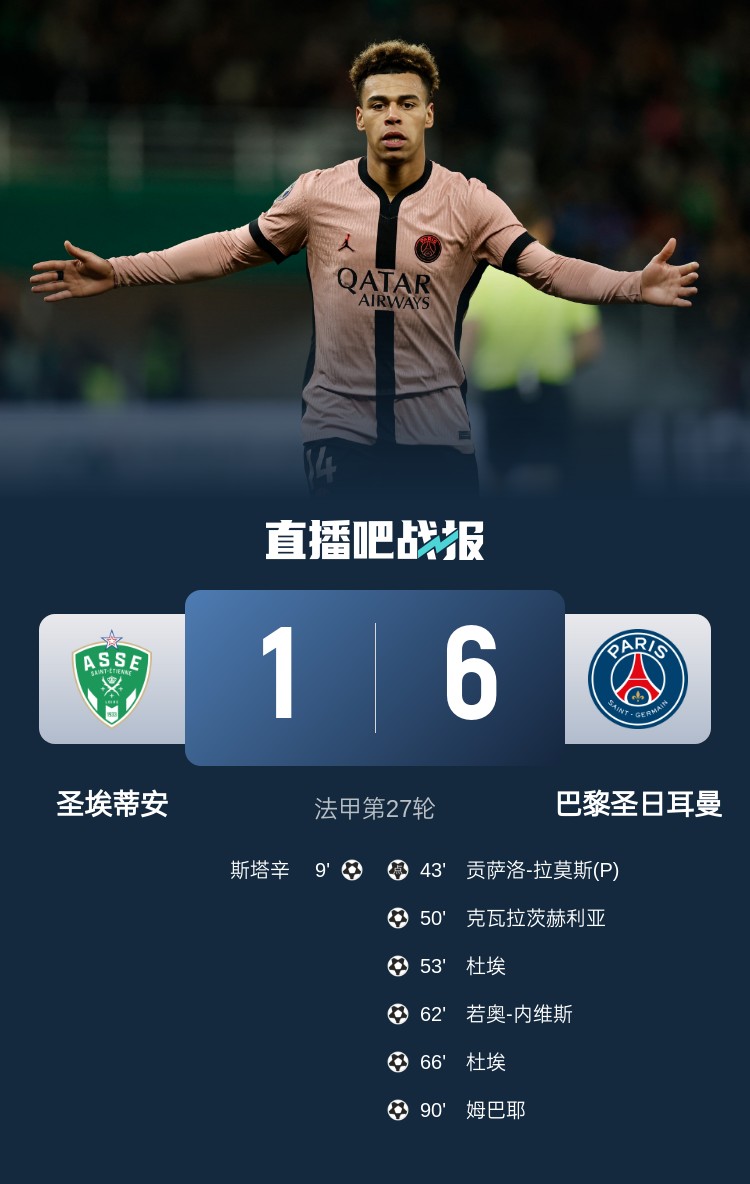 法甲第27輪,巴黎6-1大勝圣埃蒂安,暫以22分優(yōu)勢(shì)領(lǐng)跑。上半場(chǎng),斯塔辛首開(kāi)紀(jì)錄,貢薩洛-拉莫斯點(diǎn)射扳平;下半場(chǎng),克瓦拉茨赫利亞擴(kuò)大比分,內(nèi)維斯破門(mén),杜埃梅開(kāi)二度,姆巴耶打進(jìn)一球。