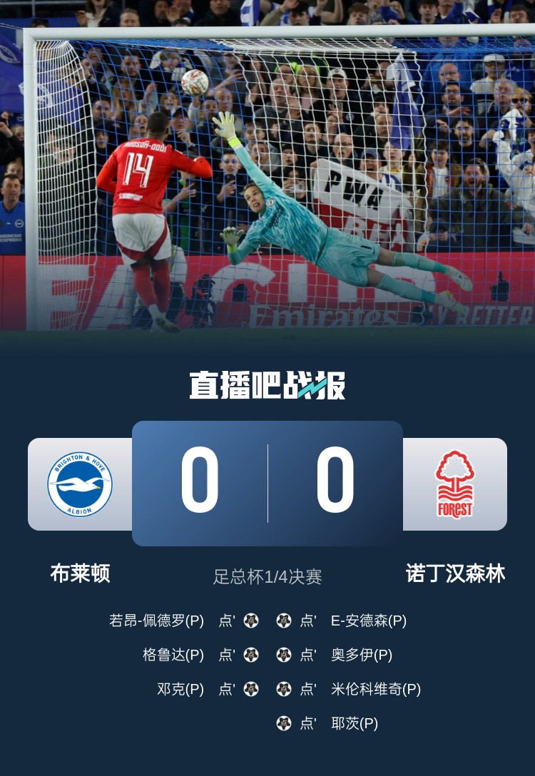 足總杯1/4決賽,布萊頓點(diǎn)球大戰(zhàn)3-4諾丁漢森林遭淘汰。上半場(chǎng),埃斯圖皮尼遠(yuǎn)射造險(xiǎn);下半場(chǎng),主裁判判罰三笘薰禁區(qū)內(nèi)犯規(guī)但VAR取消點(diǎn)球;加時(shí)賽,佩德羅破門(mén)但助攻的埃斯圖皮尼安越位;點(diǎn)球大戰(zhàn),辛謝爾伍德、戈麥斯主罰被撲出,威廉姆斯爆射打飛。