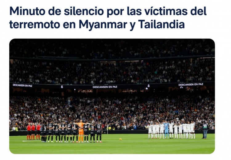 2025-03-30 14:12:27皇馬、萊加內斯賽前列隊為緬甸、泰國地震遇難者默哀