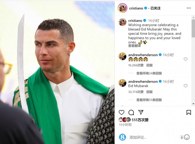 2025-03-31 12:02:36C羅社媒送開齋節祝福:愿這個日子給大家帶來喜悅、安寧與幸福