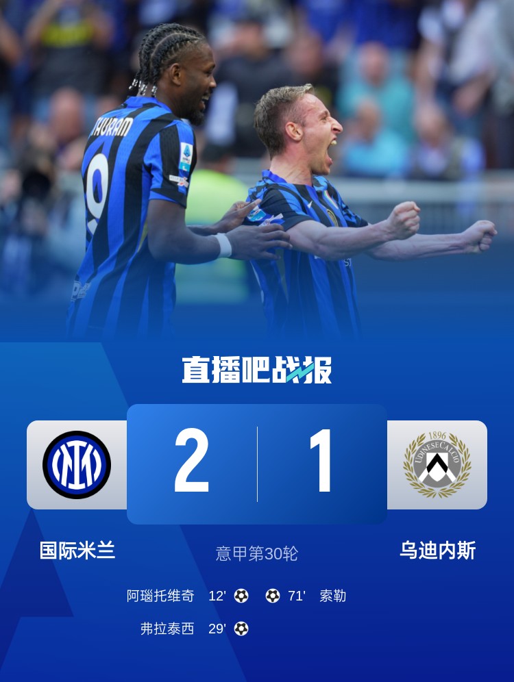 意甲第30輪,國際米蘭2-1烏迪內斯,阿瑙托維奇、弗拉泰西破門,索默神撲。
