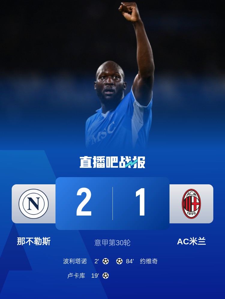意甲第30輪,那不勒斯2-1AC米蘭,波利塔諾開場閃擊,盧卡庫破門。