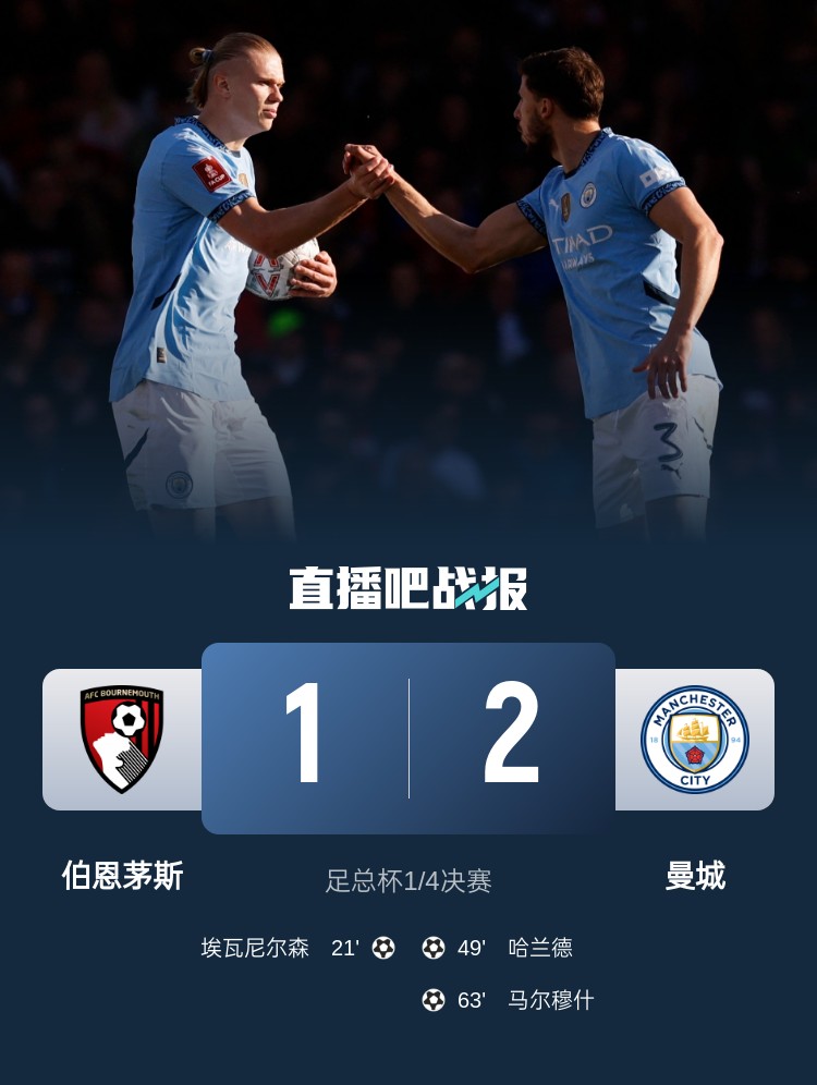足總杯1/4決賽,曼城2-1逆轉伯恩茅斯,哈蘭德破門+傷退,奧賴利2助攻。