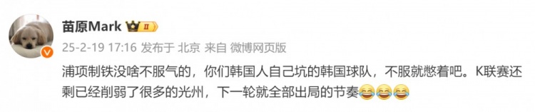 媒體人苗原發文表示:浦項鐵人沒啥不服氣的,你們韓國人自己坑的韓國球隊,不服就憋著吧。K聯賽還剩已經削弱了很多的光州,下一輪就全部出局的節奏。