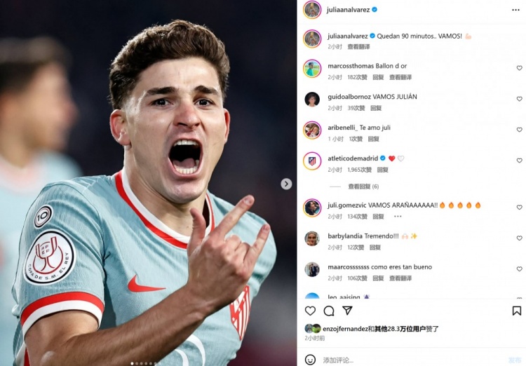 2025-02-26 15:01:57對巴薩傳射建功,阿爾瓦雷斯社媒曬照:還有90分鐘,我們加油!