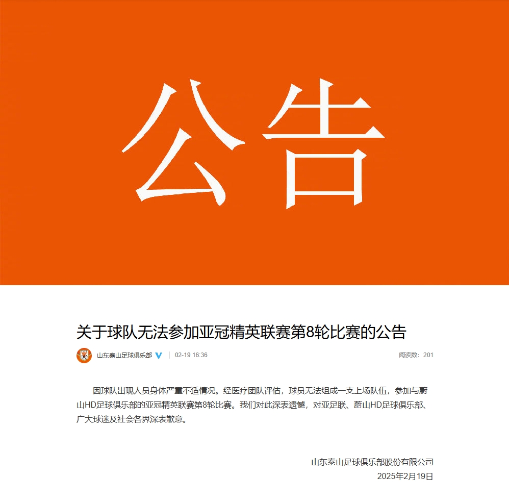 2025-02-19 20:25:03泰山退賽聲明:球隊出現(xiàn)人員身體嚴(yán)重不適 無法組成一支上場隊伍