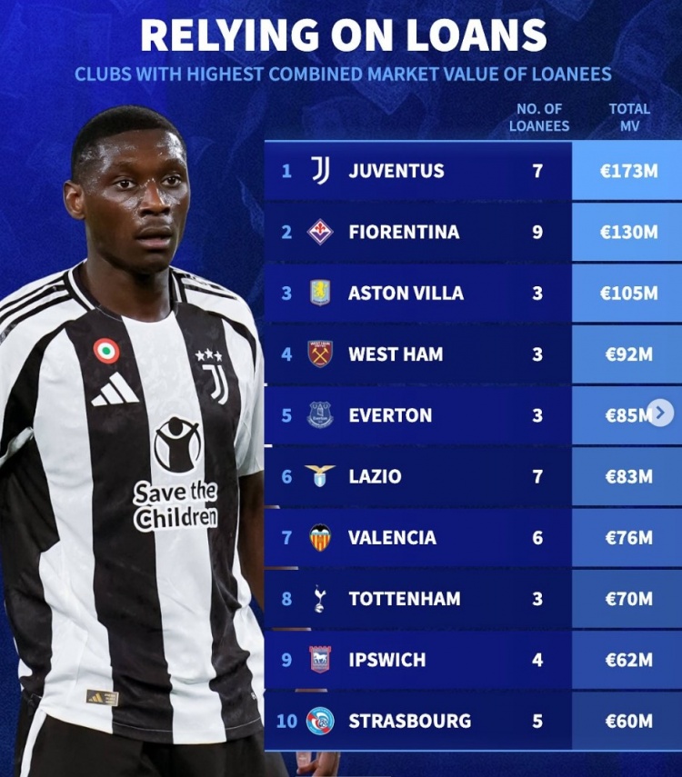 2025-02-19 20:25:04德轉列隊內租將身價榜:尤文1.73億歐居首,紫百合&維拉&熱刺在列
