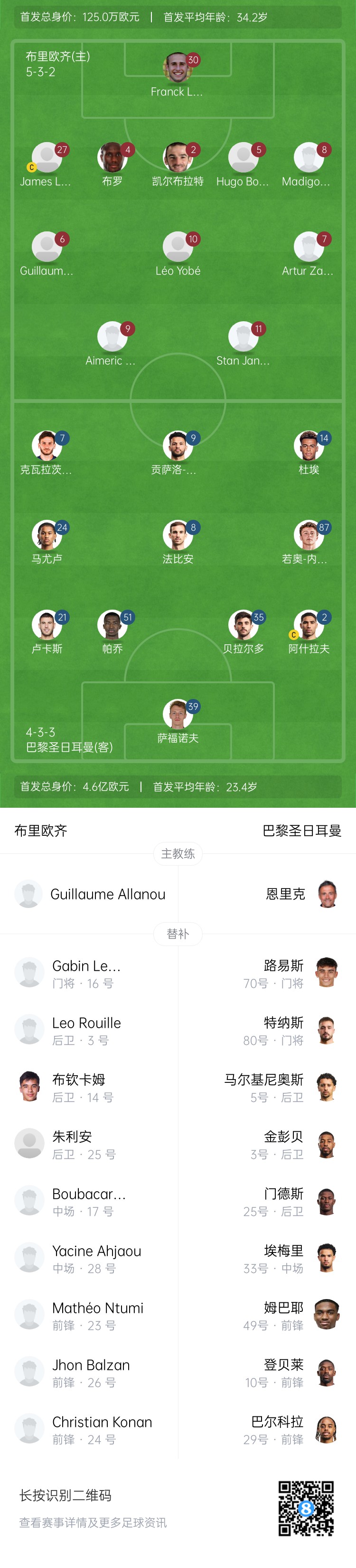02月26日訊 法國杯1/4決賽,布里歐齊主場vs巴黎圣日耳曼即將打響。賽前首發出爐。