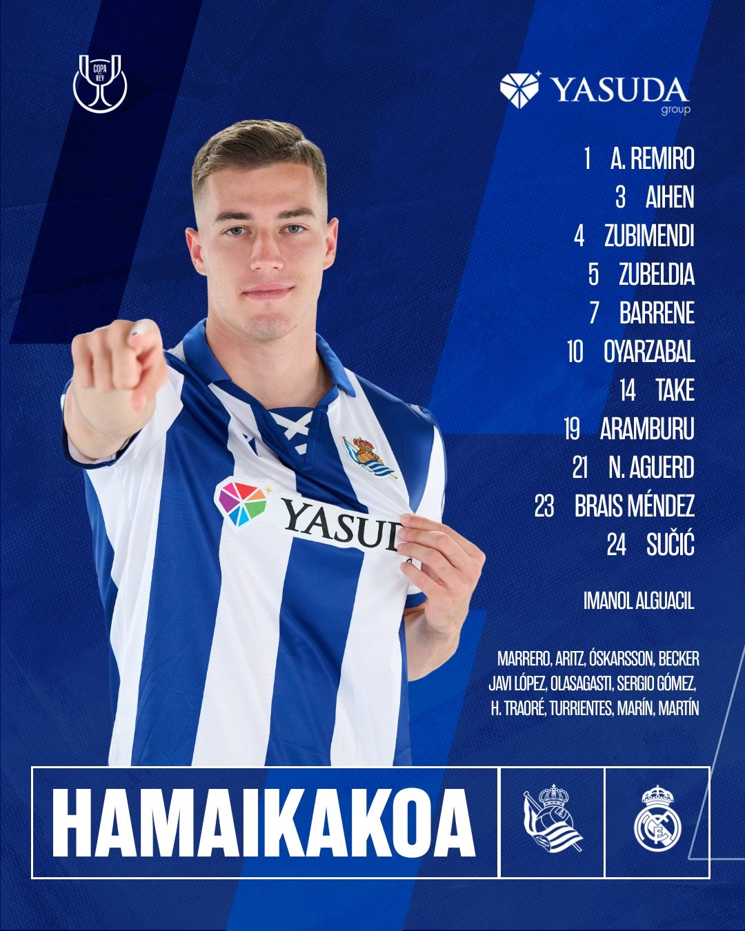 皇家社會首發:1-雷米羅、3-穆尼奧斯、21-阿格爾德、4-祖比門迪、5-祖貝迪亞、23-布萊斯-門德斯、24-蘇西奇、7-巴雷內切亞、14-久保建英、10-奧亞薩瓦爾、19-阿蘭布魯