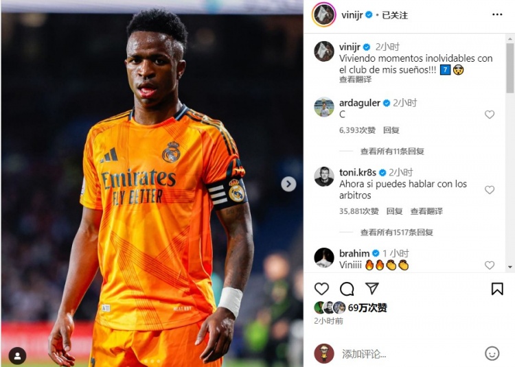 2025-02-27 10:00:14維尼修斯社媒發(fā)文慶祝勝利:與我夢中的俱樂部一起經(jīng)歷難忘時刻