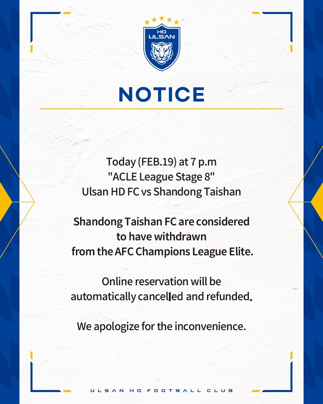 2025-02-19 20:25:19真不踢了!蔚山HD官方:由于泰山退賽,本場比賽取消并進行退票