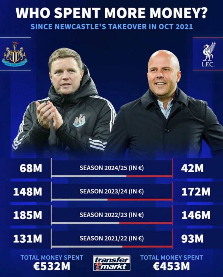 紐卡被沙特收購后4年共投資5.32億歐元,同期利物浦4.53億歐