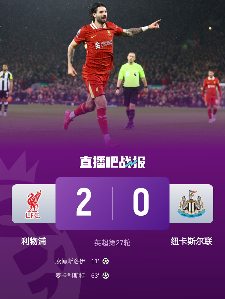 索博斯洛伊、麥卡利斯特破門,利物浦主場2-0戰(zhàn)勝紐卡,多賽一場領(lǐng)先阿森納13分。