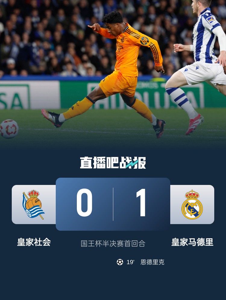 國王杯-皇馬1-0皇家社會占先機 恩德里克制勝球+中楣貝林獻助攻