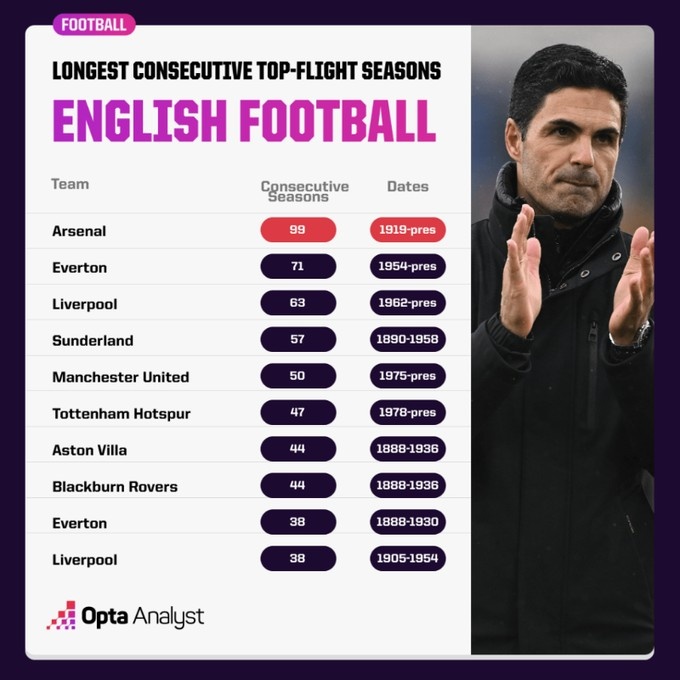 阿森納自1919年開始一直在英格蘭頂級聯賽征戰,下賽季他們將在英格蘭頂級聯賽連續征戰100個賽季,是連續征戰頂級聯賽時間最長的英格蘭球隊。