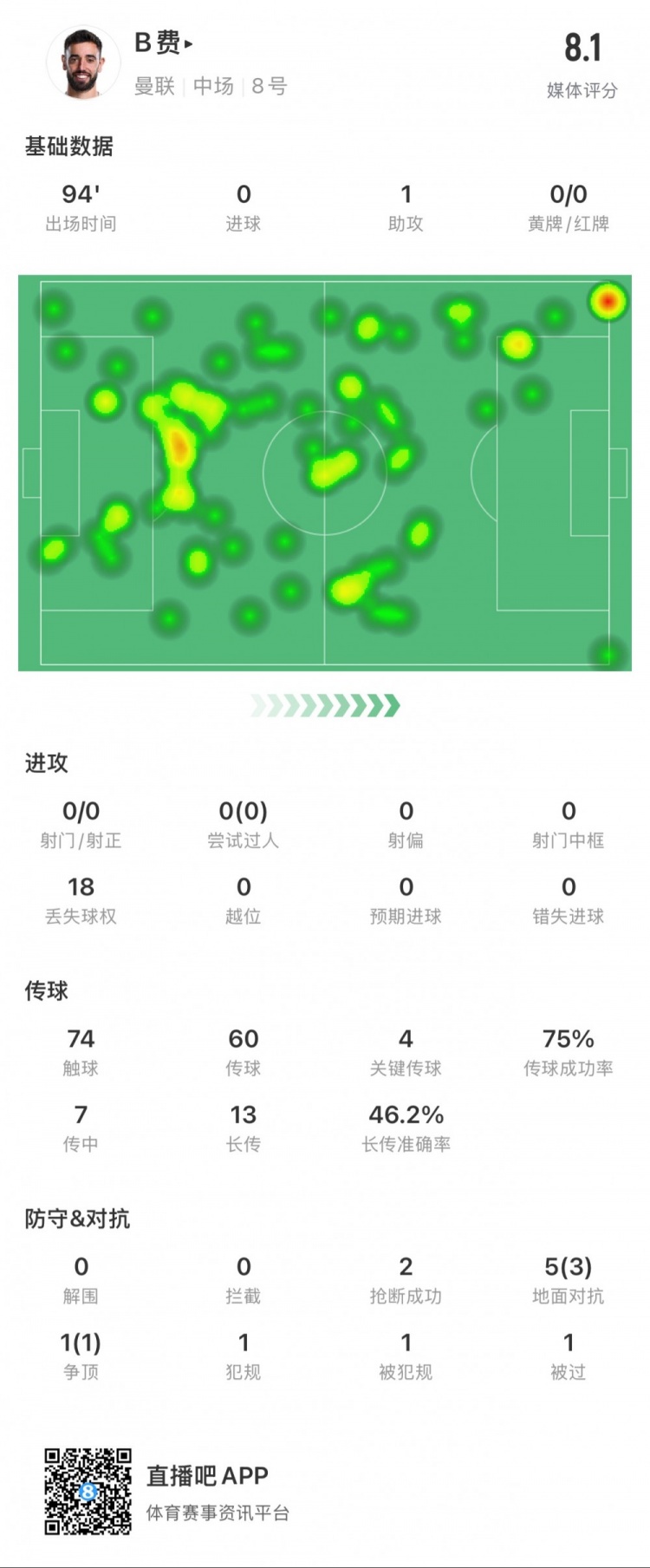 2025-02-27 10:02:08B費(fèi)本場數(shù)據(jù):1次助攻,4次關(guān)鍵傳球,14次長傳成功7次