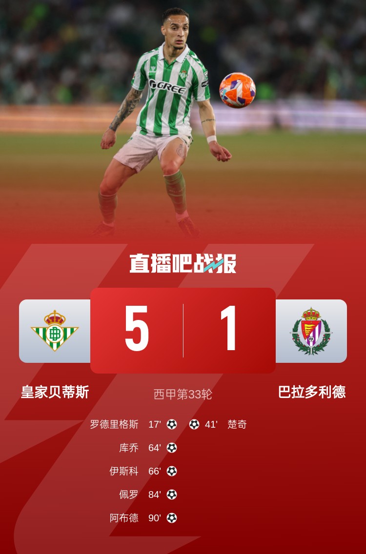 貝蒂斯5-1大勝巴拉多利德,先賽躋身歐冠區(qū),同時送巴拉多利德提前5輪降級。