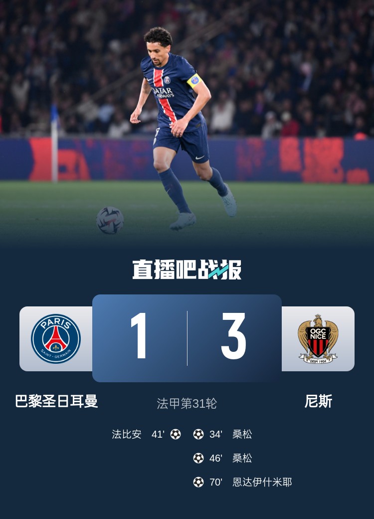 法甲賽場(chǎng),巴黎1-3不敵尼斯,球隊(duì)聯(lián)賽賽季不敗遭到終結(jié)。