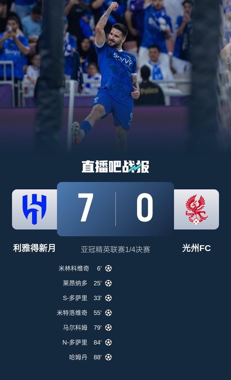 利雅得新月7-0大勝光州FC,強(qiáng)勢(shì)挺進(jìn)亞冠精英聯(lián)賽四強(qiáng)。