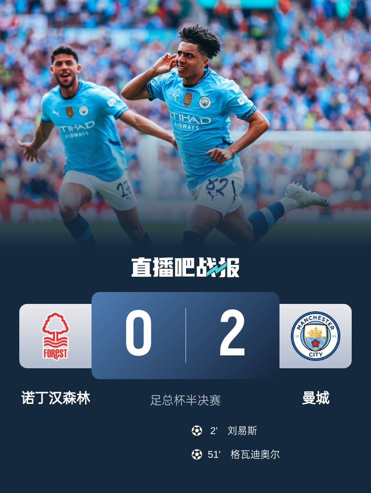 劉易斯閃擊得手,格瓦迪奧爾頭球破門(mén),曼城2-0諾丁漢森林連續(xù)三年進(jìn)決賽將戰(zhàn)水晶宮。