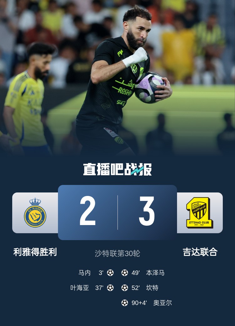 吉達聯合本輪3-2逆轉絕殺利雅得勝利!本澤馬、坎特和奧亞爾均破門。