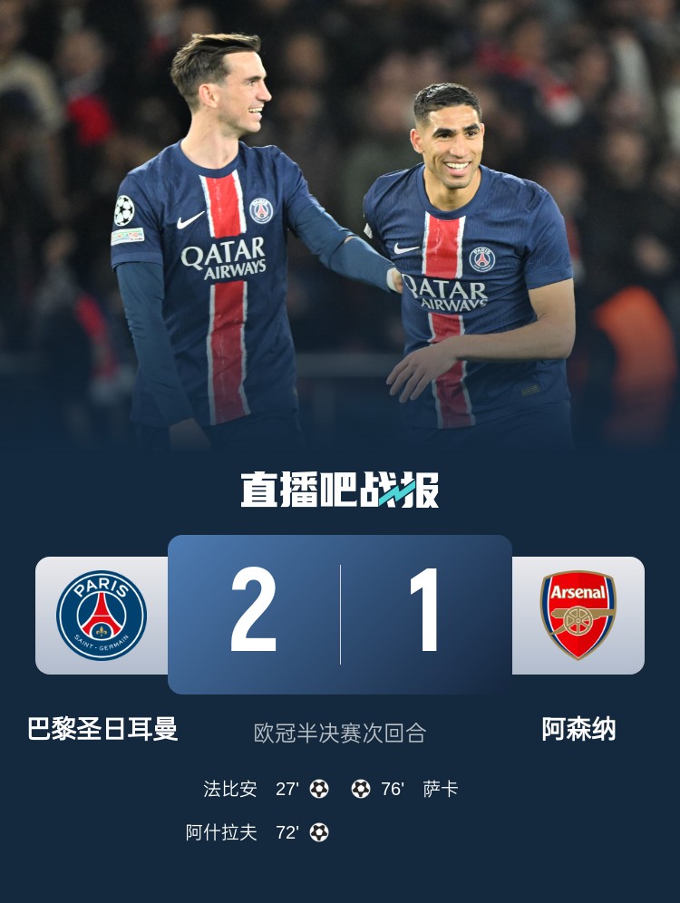 歐冠半決賽次回合,巴黎2-1總比分3-1淘汰阿森納,隊史第2次晉級歐冠決賽。