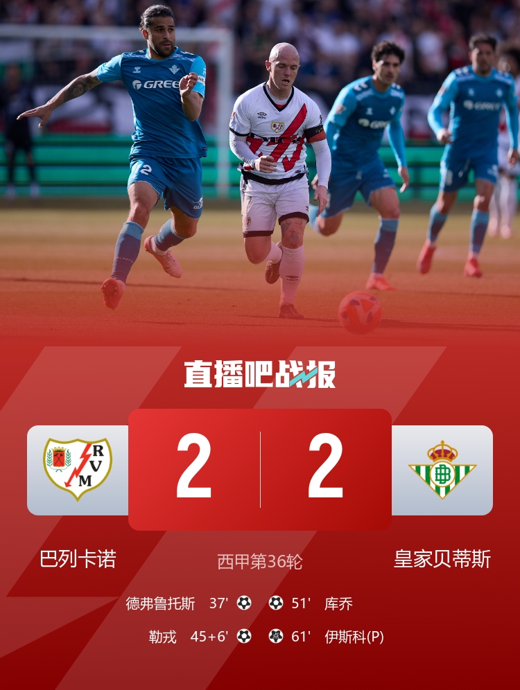 貝蒂斯客場2-2戰(zhàn)平巴列卡諾,西甲2連平!還剩2輪的情況下,落后歐冠區(qū)5分。