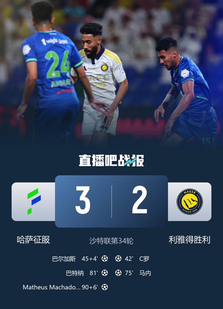 沙特聯第34輪,利雅得勝利2-3哈薩征服無緣亞冠。上半場,法蒂爾助攻C羅頭球首開記錄,巴爾加斯包抄扳平比分,阿奇迪屢獻神撲;下半場,馬內推射破門反超比分,巴特納任意球世界波破門,馬沙多補時絕殺。