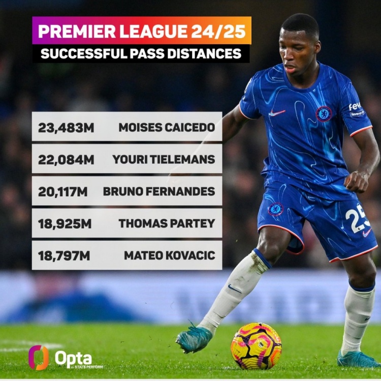3月1日訊 OPTA統計了本賽季英超成功傳球距離榜,藍軍后腰凱塞多居首。
