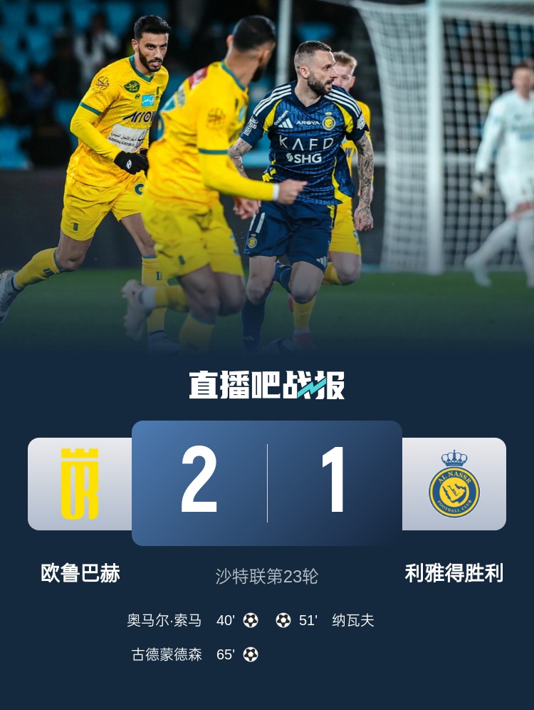 沙特聯第23輪,利雅得勝利1-2不敵歐魯巴赫。上半場,奧馬爾凌空斬;下半場,納瓦夫替補扳平,古德蒙德森世界波,C羅任意球被撲。