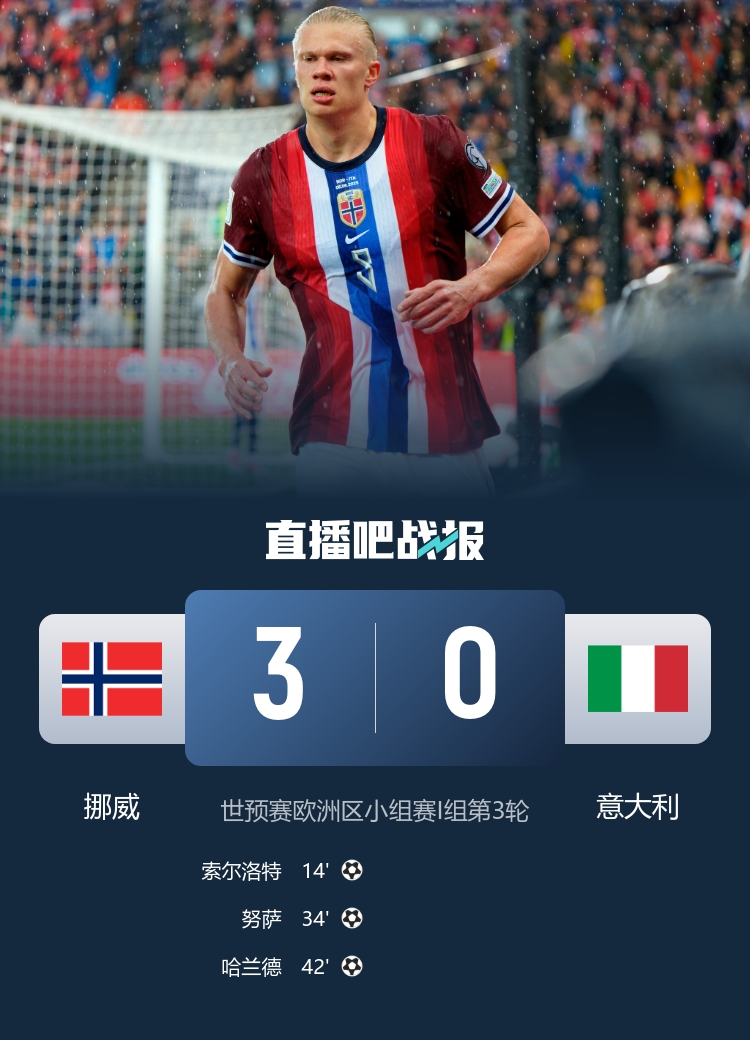 世預賽歐洲區,意大利0-3慘敗于挪威,哈蘭德、索爾洛特、努薩各入一球。