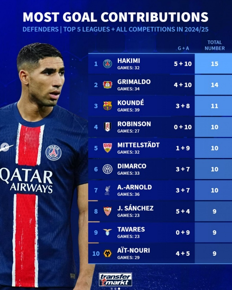 2025-03-01 20:23:44本賽季五大聯(lián)賽后衛(wèi)參與進(jìn)球榜:阿什拉夫居首,孔德、阿諾德在列