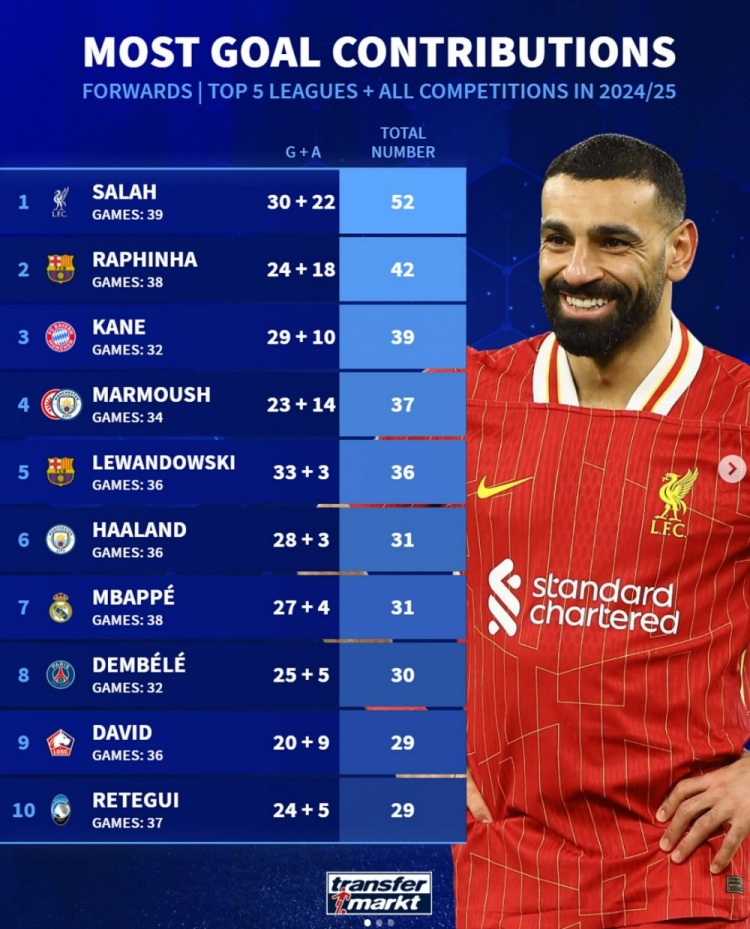 2025-03-01 20:24:18本賽季五大聯賽前鋒參與進球榜:薩拉赫52球居首,拉菲尼亞次席
