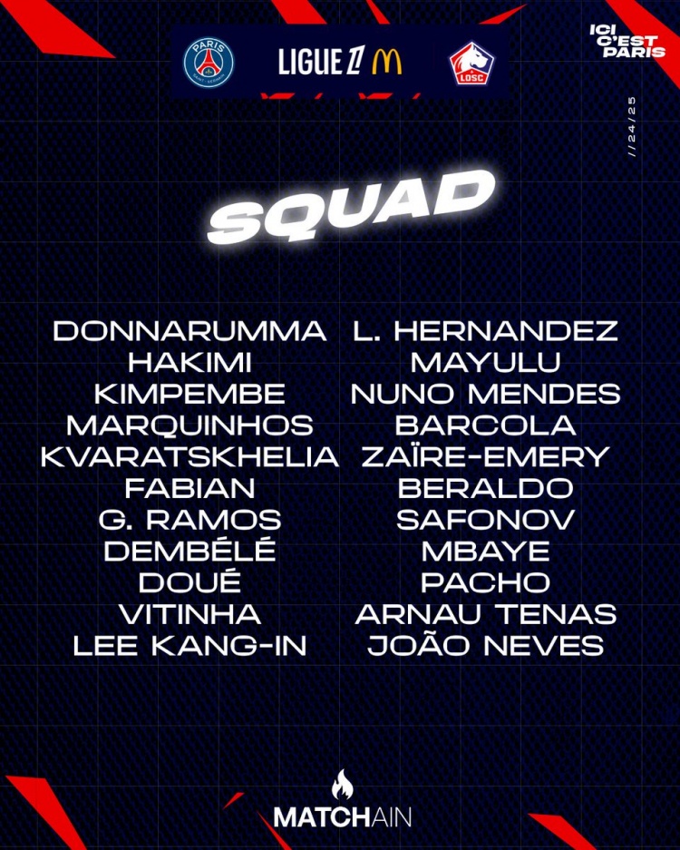 2025-03-01 20:25:47巴黎vs里爾大名單:馬爾基尼奧斯、克瓦拉茨赫利亞、登貝萊在列