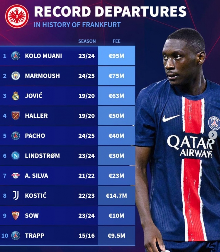 2025-03-02 01:12:16法蘭克福隊史賣人榜:穆阿尼&馬爾穆什領銜,約維奇&阿萊在列