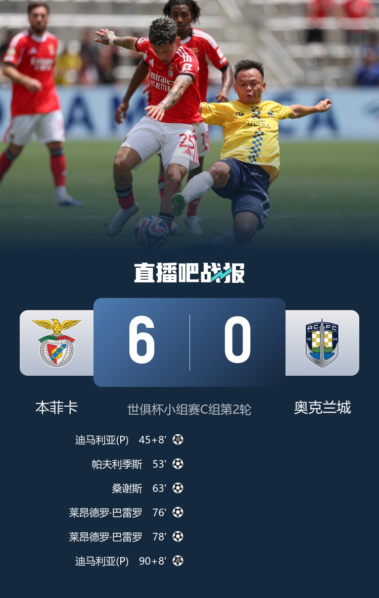 世俱杯-本菲卡6-0奧克蘭城 下半場因天氣推遲2個半小時