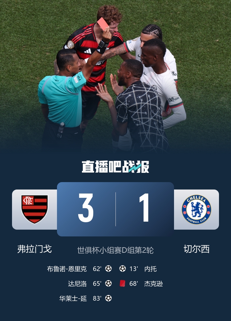 世俱杯小組賽D組第2輪,切爾西1-3負于弗拉門戈,杰克遜替補僅4分鐘蹬踏染紅。弗拉門戈2連勝6分領跑,切爾西3分第二。