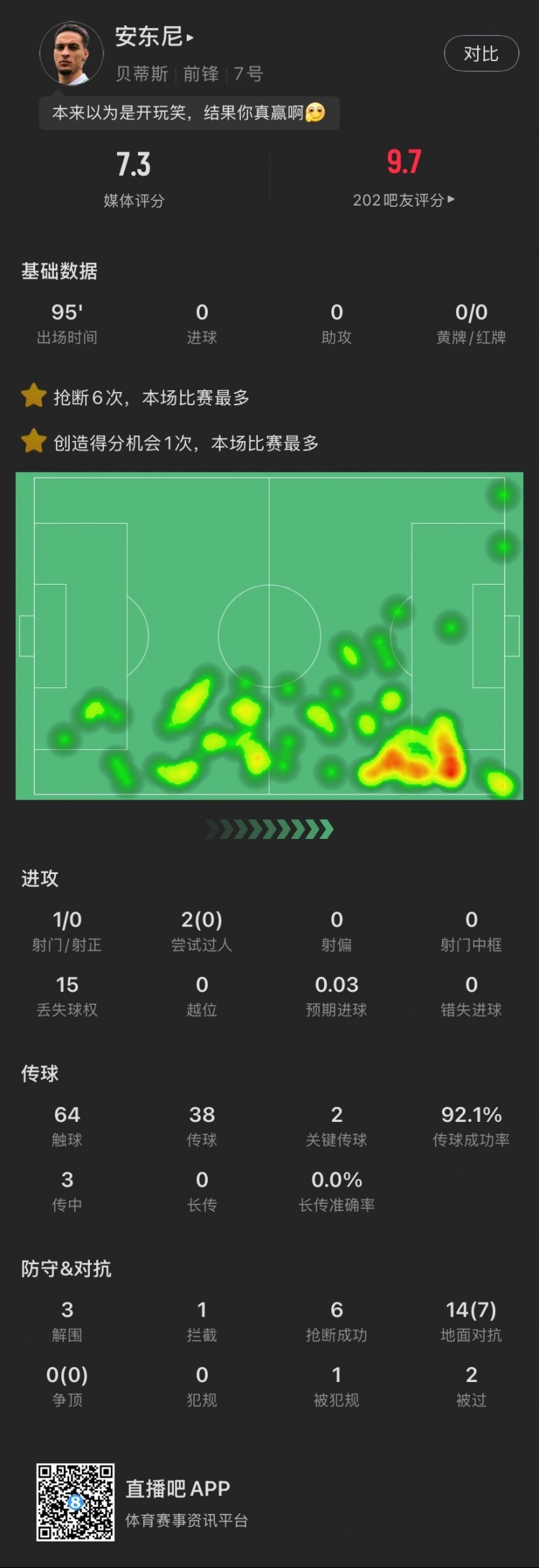2025-03-02 05:02:54安東尼本場:搶斷6次全場最多,2腳關鍵傳球&3解圍,造阿拉巴黃牌