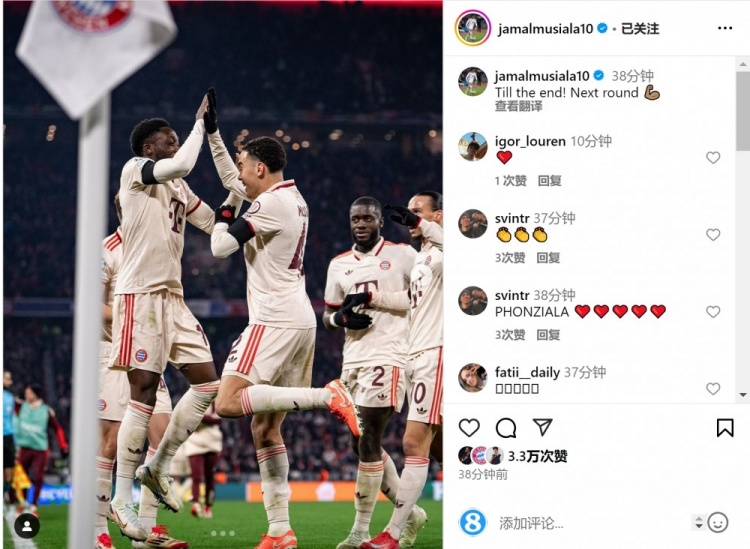 2025-02-19 20:28:02穆西亞拉社媒曬與戴維斯慶祝照片:戰斗到最后!晉級下一輪