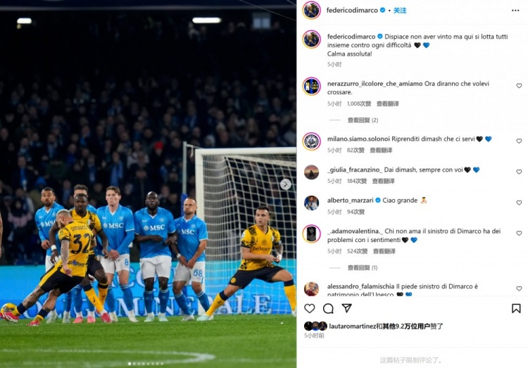 2025-03-02 16:13:00迪馬爾科曬任意球破門瞬間:很遺憾未能取勝,但我們在團結拼搏